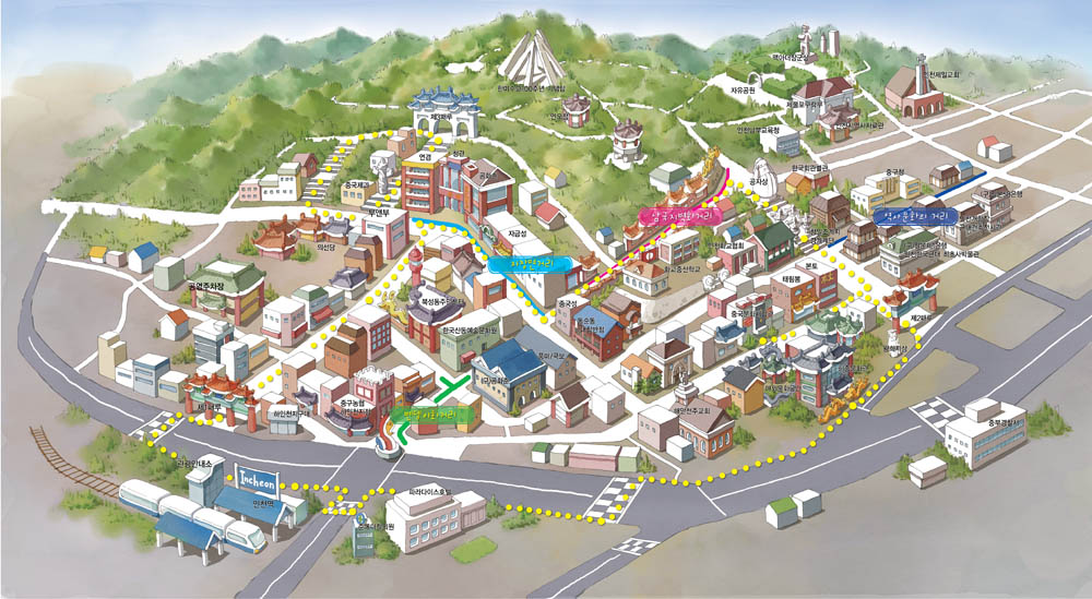 차이나타운은 중국의 전통 색인 붉은빛을 고수한다. 인천역 앞에 우뚝 솟아 있는 패루의 붉은 문양은 화려하기 그지없고, 드문드문 퍼져 있기는 하지만 10여 곳의 중국 요리점 간판과 대문 또한 붉은빛이다.